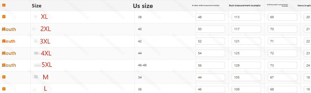 Sizes: M, L, XL, 2XL, 3XL, 4XL, 5XL